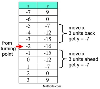 • The table also can show the symmetry of the graph. Moving a designated distance "back" and "ahead", on the x-axis, from the turning point at x = -2, will yield the same y-values at each of those points.