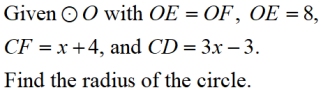 • ΔOFC is a right triangle with leg = 15 and a leg of 8. By Pythagorean Theorem, the hypotenuse, OC (radius) = 17. |