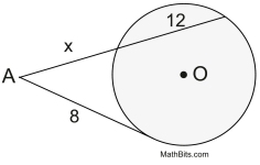 If a secant segment and tangent segment are drawn to a circle from the same external point, the length of the tangent segment is the geometric mean between the length of the secant segment and the length of the external part of the secant segment. |