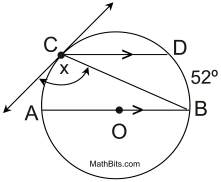 A tangent-chord angle of a circle is an angle formed by a tangent and a chord drawn to the point of tangency on the circle. (The vertex lies on the circle.) |