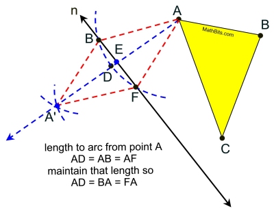 | Addendum: If you DO NOT CHANGE the compass length after making the arc from point A, you can save yourself a step. If the second set of crossing arcs are created with that same length, the intersection point will be the image point, A'. Copying length AE is not needed. |