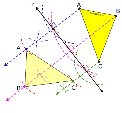 Choose a starting vertex (such as A). Construct a perpendicular from A to the line of reflection. Measure the length from A to the intersection point. Copy this length on the perpendicular bisector starting at the intersection point to find A'.