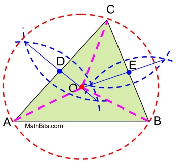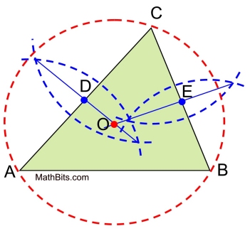 Proof of Construction: Draw radii from O to C, from O to A and from O to B. Since point O lies on the perpendicular bisector of , point O is equidistant from A and from B (OA = OB). Any point on a perpendicular bisector of a segment is equidistant from the ends of the segment. Since O also lies on the perpendicular bisector of , point O is also equidistant from B and from C (OB = OC). So, we have OA = OB = OC.