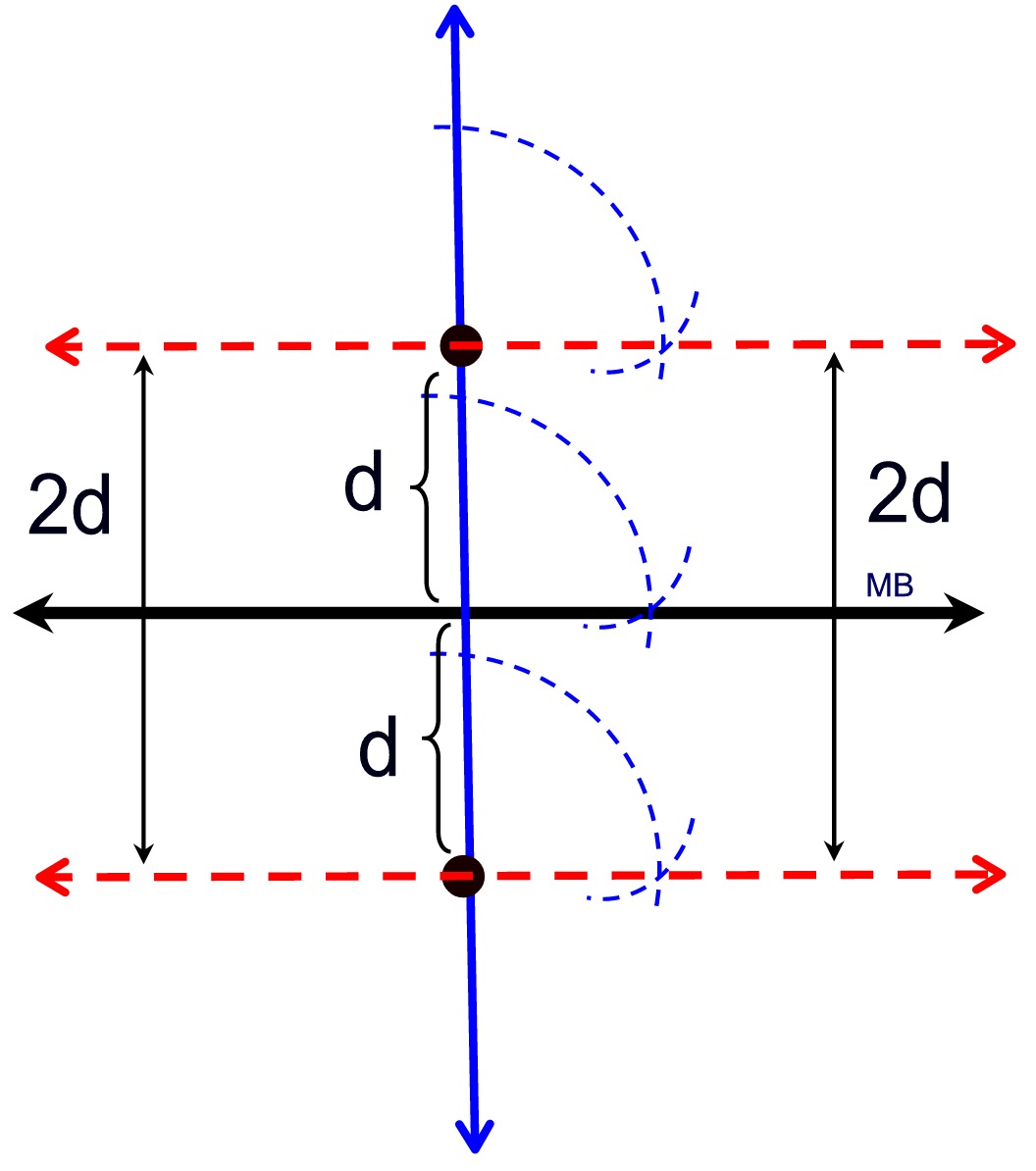 | Locus Theorem 2: The locus at a fixed distance, d, from a line m, is a pair of parallel lines at a distance of d from line m, and located on either side of m. |