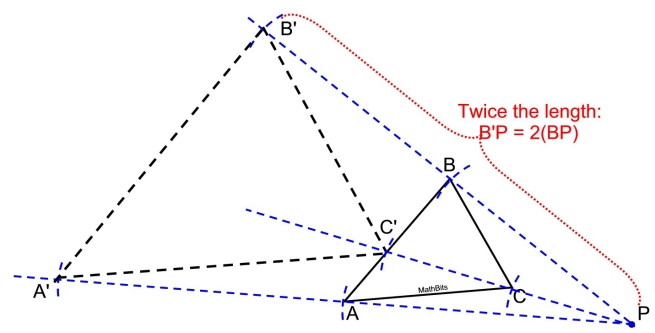 4. Draw ΔA'B'C' (It is not always the case that the new triangle will touch, or be inside, the given triangle.) |