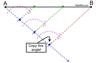 3. Using the Partition Construction, shown above, divide the given segment into 5 equal pieces. (The construction lines have been removed from the diagram. Only the finished segment remains.) |