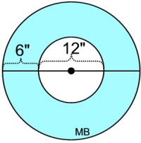 Two concentric circles are shown at the right. Using the information given, find the area of the shaded (colored) portion of the larger circle.