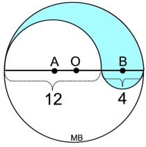 The diagram at the right is one full circle and two semicircles. The black dots indicate the centers, A, O, and B. Using the given information, determine the area of the shaded (colored) section. Express answer in terms of π.