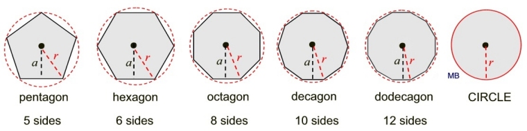We saw in the "Types of Regular Polygons" chart that as the number of sides of a regular polygon increases, the appearance of the polygon approaches that of a circle.