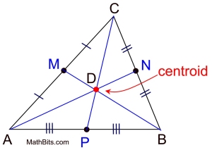 The "Centroid" Theorem says that the location of the point, called the centroid, divides each of the medians of the triangle into a ratio of 2:1. The longer portion of the median will be connected to the vertex of the triangle.