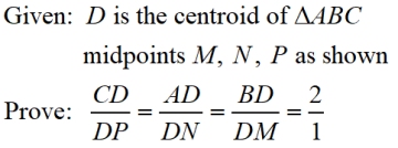 (Centroid Theorem): The centroid of a triangle divides each median in the ratio 2 : 1. (proof below) |