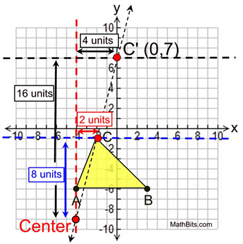 By observation, point C is 8 vertical units above the center of dilation. Under a scale factor of 2, point C' needs to be 16 vertical units from the center.