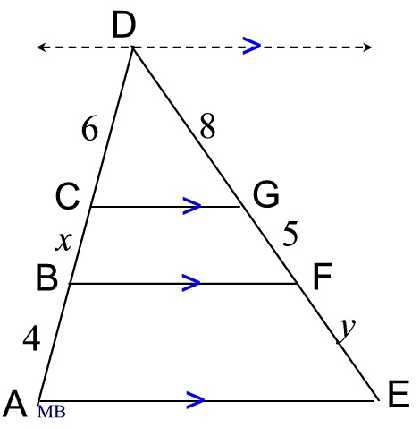 In this diagram, there are 3 parallel lines intersecting 2 transversals. The parallels are dividing the transversals proportionally.