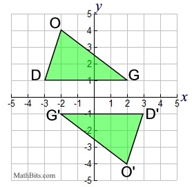 Reflect the figure over the x-axis, then translate that result by the mapping (x, y) → (x - 5, y + 2).