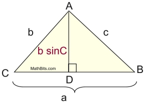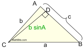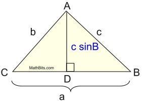 • Finally, using acute ∠A, with a new height value, h = CD, we have sin A = h/b, which gives h = cbsin A, or