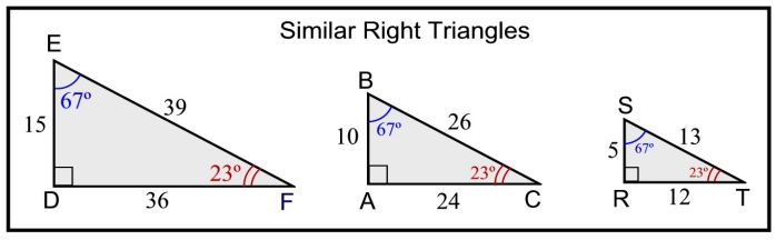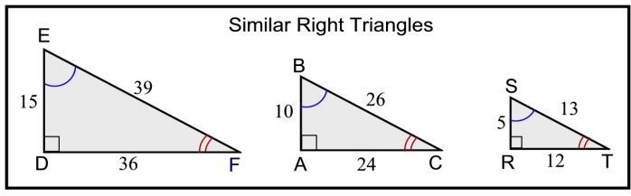 All three triangles, shown above, are similar right triangles. Notice the congruent angles.